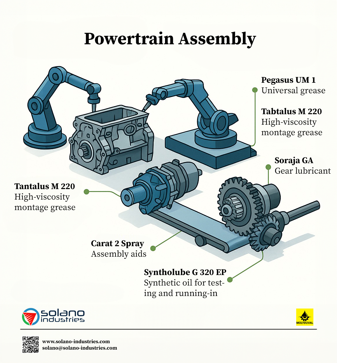 Kad visi automašīnas komponenti ir sagatavoti, tie nonāk gala montāžas līnijā. Šeit katram elementam nepieciešama atbilstoša eļļošana, kontaktu aizsardzība un mehāniskā saderība. Molyduval produkti palīdz nodrošināt uzticamu montāžas procesu.