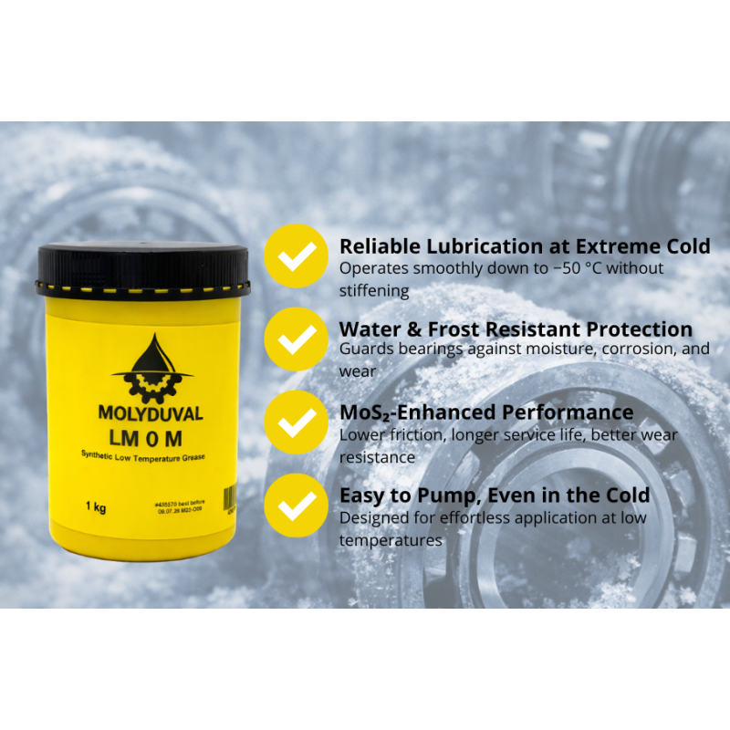 Ein Tieftemperaturfett zur Schmierung von Wälz- und Gleitlagern, die bei Temperaturen bis −50 °C betrieben werden. Es ist frost- und wasserbeständig und enthält Korrosionsschutzadditive, die zusätzlichen Schutz bei Wasser- oder Feuchtigkeitseinwirkung bieten. Das Fett ist bei niedrigen Temperaturen leicht aufzutragen und pumpbar. Zudem enthält es MoS₂ zur Reibungsreduzierung und verbessertem Verschleißschutz. Tieftemperaturfette enthalten in der Regel niedrigviskose Grundöle und sind daher auch für Hochgeschwindigkeitsanwendungen geeignet.