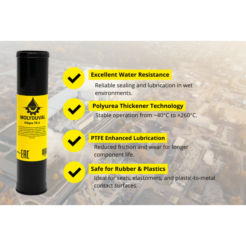Det fasta smörjmedlet PTFE minskar friktion och slitage samt ökar smörjeffektiviteten.